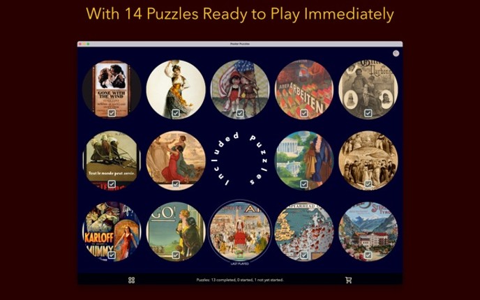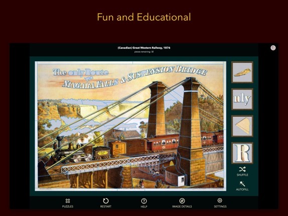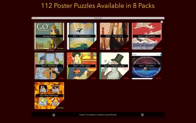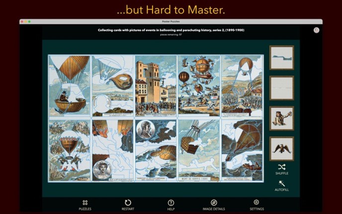 Can you rebuild these fascinating posters? Like a jigsaw puzzle but each piece is a cut-out piece of the poster which needs to be put back into the right place. 112 poster puzzles available to play immediately! EASY TO LEARN Simple drag and drop interface that works for adults and children. A simple tutorial on "How To Play" is included. Puzzles in each pack start easy and get harder the more yo… If you enjoyed this game, see our list of games similar to Poster Puzzles.