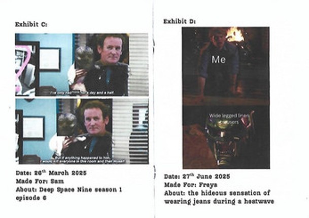 An exploration of all the stupid memes I make on Canva to send to my friends. I'm gonna be honest, guys, I have no idea what this is, I guess it came to me in a vision. Printing instructions: Select 'shrink oversized pages' and then print double sided on A4 paper. Fold and staple! If you enjoyed this game, see our list of games similar to Canva Memes Zine.