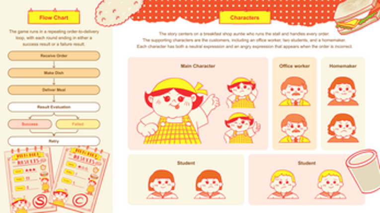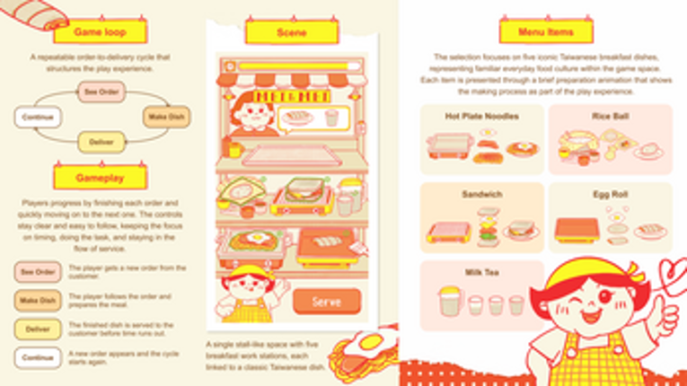 “Ready to Order" is a short 2D time-management cooking game inspired by Taiwanese breakfast culture. In Taiwan, breakfast shops offer a wide variety of dishes, and the breakfast vendors work with speed, precision, and endurance while carrying the pressure of a busy morning. This game invites players to step into that role, to prepare dishes and send out orders within a limited time, and to experie… If you enjoyed this game, see our list of games similar to Ready to Order.