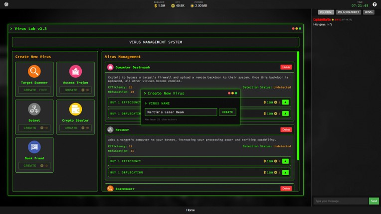 hackSociety is an immersive, online hacking simulator. In a persistent online world, you'll explore a unique array of opportunities and gameplay paths as a hacker. It modernizes the old, dead genre of 'click hack, steal their money, repeat'. You'll build custom exploits and malware, make them work and bypass antivirus detection, and pick what you want to specialize in. Do you want to get into th… If you enjoyed this game, see our list of games similar to hackSociety.
