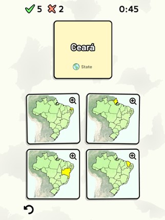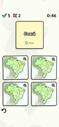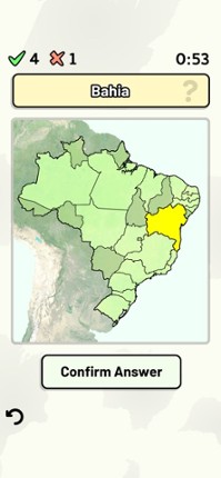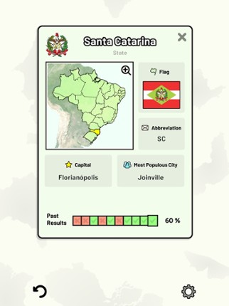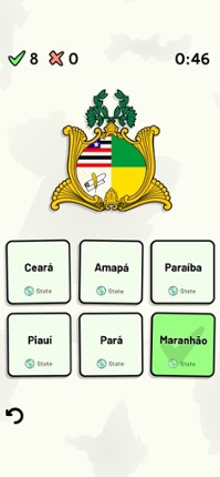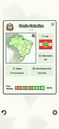 Quizzes cover 6 topics about the Brazilian states: - Locations on a map - Capital cities - Most populous cities - Flags - Coat of Arms - State abbreviations (ISO 3166-2) Customizable quizzes allow you to choose which states to test, as well as the topic. Past results for each state are displayed to highlight your progress at each topic. All content can be accessed for free. An optional in-app p… If you enjoyed this game, see our list of games similar to States of Brazil Quiz.