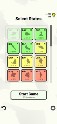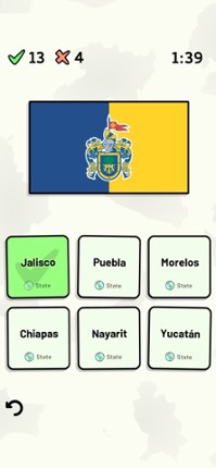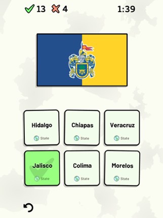 Quizzes cover 6 topics about the Mexican states: - Locations on a map - Capital cities - Most populous cities - Flags - Coat of Arms - State abbreviations (ISO 3166-2) Customizable quizzes allow you to choose which states to test, as well as the topic. Past results for each state are displayed to highlight your progress on each topic. All content can be accessed for free. An optional in-app pur… If you enjoyed this game, see our list of games similar to States of Mexico Quiz.