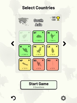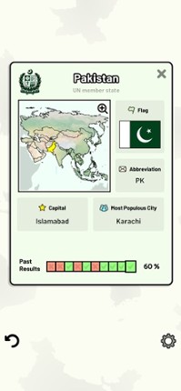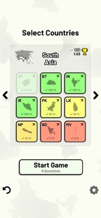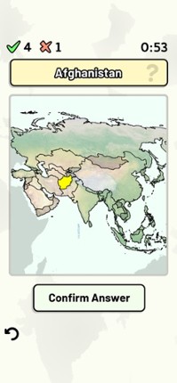 Quizzes cover 6 topics about the Asian countries: - Locations on a map - Capital cities - Most populous cities - Flags - Coat of arms - Country abbreviations (ISO 3166-2) Customizable quizzes allow you to choose which Asian countries to test, as well as the topic. Past results for each country are displayed to highlight your progress at each topic. Standard quizzes allow you to learn each topi… If you enjoyed this game, see our list of games similar to Countries of Asia Quiz.