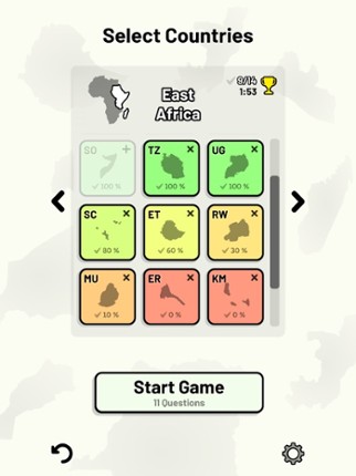 Quizzes cover 6 topics about the African countries: - Locations on a map - Capital cities - Most populous cities - Flags - Coat of Arms - Country abbreviations (ISO 3166-2) Customizable quizzes allow you to choose which countries to test, as well as the topic. Past results for each country are displayed to highlight your progress at each topic. All content can be accessed for free. An optional … If you enjoyed this game, see our list of games similar to Countries of Africa Quiz.