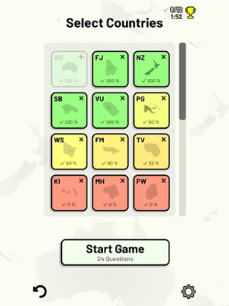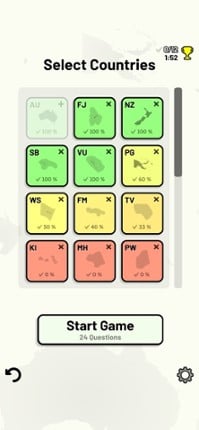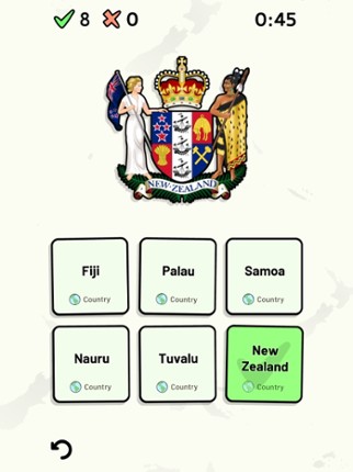 Quizzes cover 6 topics about the countries of Oceania: - Locations on a map - Capital cities - Most populous cities - Flags - Coat of arms - Country abbreviations (ISO 3166-2) Customizable quizzes allow you to choose which countries to test, as well as the topic. Past results for each country are displayed to highlight your progress at each topic. Standard quizzes allow you to learn each topic… If you enjoyed this game, see our list of games similar to Countries of Oceania Quiz.