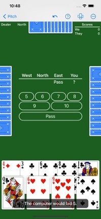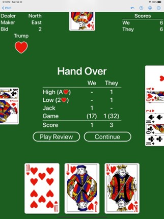 Play the popular card games Pitch (High Low Jack), Auction Pitch (Setback), Smear, Pidro, and Pedro. Either team up with a NeuralPlay AI partner or play solo (cutthroat) against the NeuralPlay AI opponents. Pitch and its variations are played with many different rules around the world. NeuralPlay Pitch offers many rule customizations to allow you to play with your favorite rules. Features includ… If you enjoyed this game, see our list of games similar to Pitch - Expert AI.