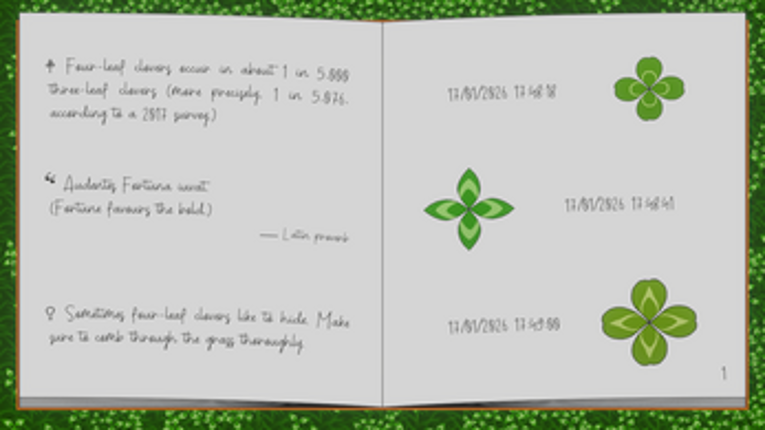 Go back to your youth and rediscover the joy of searching for a four-leaf clover in your grandma's garden. What awaits you Find the four-leaf clover hidden in a patch full of clovers, in an almost realistic environment (~1 in 2,500 chance in-game vs ~1 in 5,000 in real life).Discover 10 authentic leaflet patterns and shapes inspired by real wild clovers found in grass patches around Piedmont… If you enjoyed this game, see our list of games similar to One in a Thousand.
