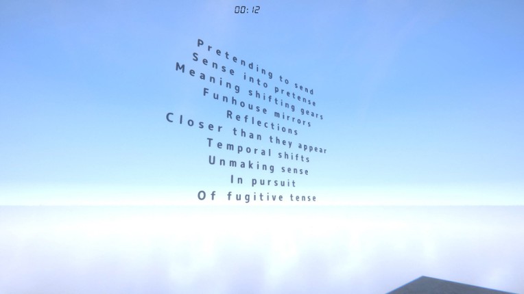 3 Fugitive Tense: A Game About Time You wake up on a platform in a cloudscape. A staircase slices upward into a sky that never quite agrees on what time it is. A poem hangs in the air, clocks twitch on the walls, and a quiet timer at the top of your vision starts to tick down. In Fugitive Tense time is your only real resource. Every step, every interaction, every wrong turn eats away at your remai…