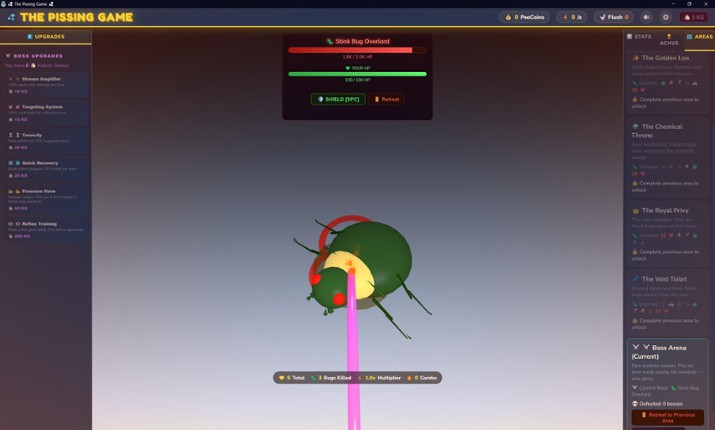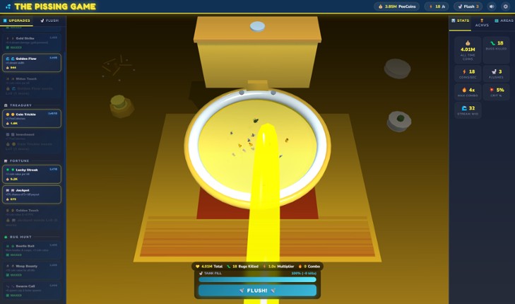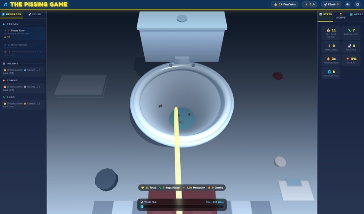 Enter a world where the most mundane of acts becomes a quest of legend. In this game, you confront the ultimate challenge of... relieving yourself into a bowl. But this is no ordinary bathroom break. As you aim, the world around you teems with relentless bugs, each one a small but formidable adversary. Every victorious strike rewards you with Piss-coins, the currency of this strange realm. With P… If you enjoyed this game, see our list of games similar to The Pissing Game.
