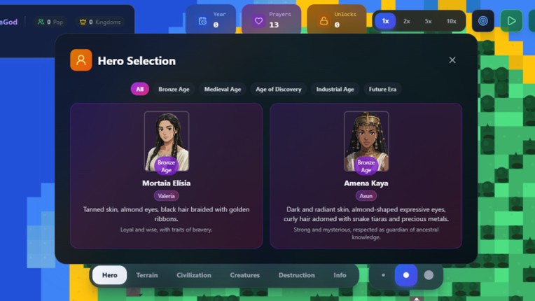 VilaGod is a god simulator where you shape the destiny of civilizations on massive maps. Unlike other god games, every action here generates dynamic chronicles: from political revolts to legendary discoveries, watch the history of your world unfold in 14 languages. Key Features: • Deep civilization simulation: Watch kingdoms evolve from the Bronze Age to a high-tech future • Dynamic prayer syste… If you enjoyed this game, see our list of games similar to VilaGod.