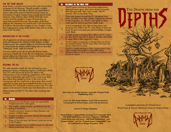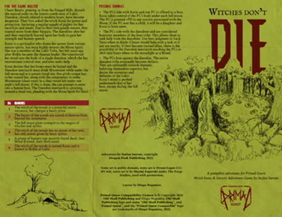 Get two pamphlet adventures for Primal Quest! Each adventure contents plenty of content to play a single session, but also leaves plenty of room to for the game master to improvise and expand on. Both adventures come as a full color PDF and a separate "printer friendly" PDF. WITCHES DON'T DIE Witches Don't Die is an adventure where the PCs encounter the spirit of a witch who was slain by a tribe … If you enjoyed this game, see our list of games similar to Primal Quest - Witches Don't Die & The Demon From The Depths.