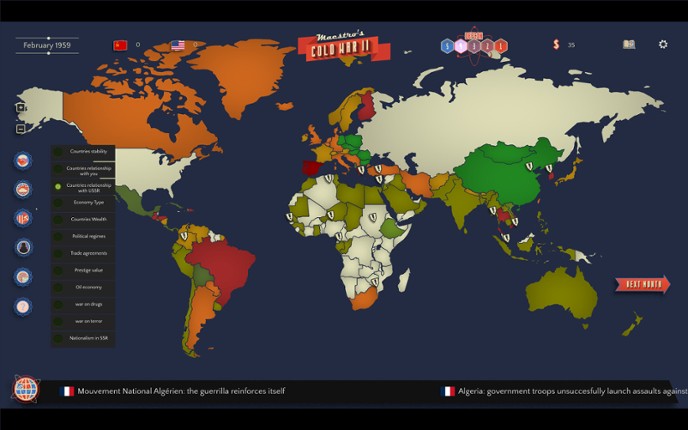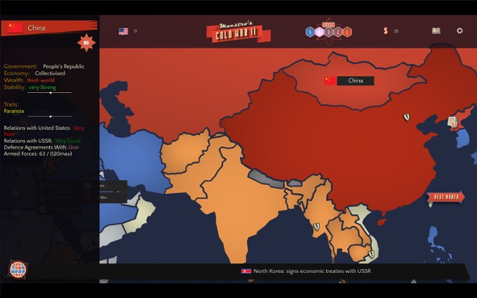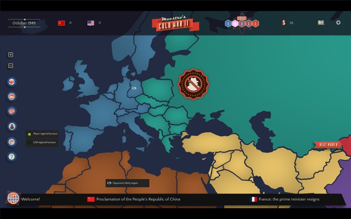 Maestro’s Cold War 2 is a replayable grand-strategy sandbox about the world’s tensest standoff of the Cold War. Play as the USA or the USSR, manage Prestige, Budget, and National Policies, and bend history through policies, proxies, diplomacy, and brinkmanship. Easy to pick-up but hard and deep enough to offer a challenge, this is the kind of game you will keep coming back to. How Does the G… If you enjoyed this game, see our list of games similar to Maestro's Cold War 2.
