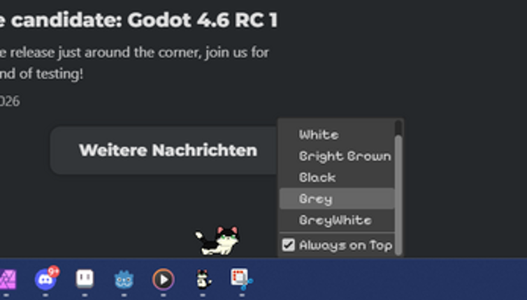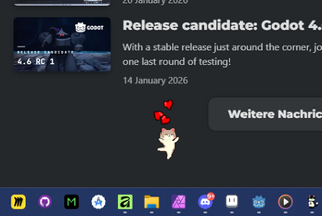 View Game8 Cozy Desktop Cat Taskbar Cat ist ein kleines, charmantes Desktop-Pet für Windows, das direkt auf deiner Taskleiste lebt. Eine neugierige Katze läuft dort herum, schläft ein, miaut, reagiert auf Klicks – und begleitet dich still durch den Tag. Kein Spiel im klassischen Sinne, sondern ein liebevolles kleines Stück Atmosphäre für deinen Desktop. ✨ Features Katze auf der Taskleiste Die K…