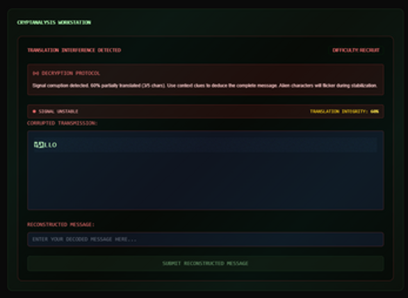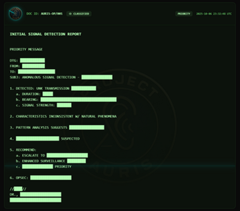 6 www.projectauris.comINCOMING TRANSMISSION... AUTHORIZATION REQUIRED You are an intelligence operative tasked with intercepting and decoding encrypted transmissions. What starts as routine cryptanalysis quickly unravels into something far more extraordinary—humanity's first contact with extraterrestrial intelligence. ABOUT THE GAME PROJECT AURIS is a terminal-based cryptography puzzle game whe…
