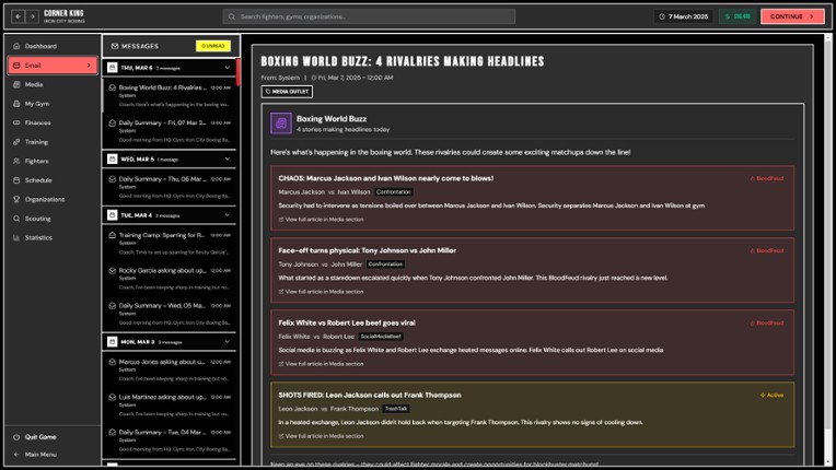 2 EMERGENT STORIES Every save plays differently. Rivalries form naturally. Media covers your gym's rise—or fall. Rival promoters poach your talent. Fighters develop grudges. One bad loss can spiral into contract disputes, injured confidence, and a gym in crisis.DEVELOP YOUR FIGHTERS Create weekly training plans with drag-and-drop scheduling Balance power, speed, stamina, defense, and technique …