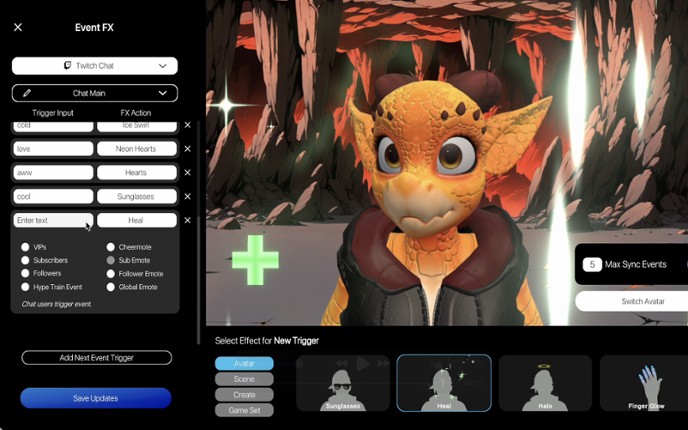 3 Be your avatar anywhere. Vtubing and Game Streaming as your character in a few clicks. Stream yourself in any software where you can pick a camera. Works on Youtube, Discord, Zoom, Twitch, and OBS to name a few. All you need is your regular cam setup to get great 60 FPS head, hand and expression animation. Game Streamer? Try out our new Stream-Event feature. Boost monetisation and engagement w…