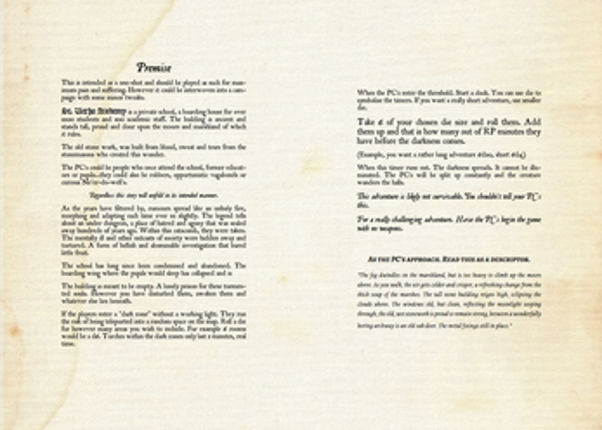 7 This 26-page adventure is a room crawl through a haunted and tortured schoolhouse. It can easily be adapted to any setting or timeline but is intended as a one-shot. Enter into the St. Verhu Acadamy and discover the dark secret lying below. Including a hand-drawn map and all artwork done by myself. Inspired by creepy 80's and 90's B-movie horrors that taunted my youth. MÖRK BORG is copyright …