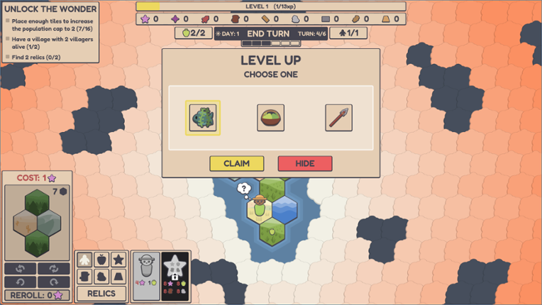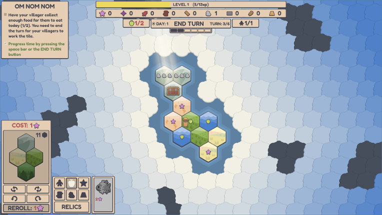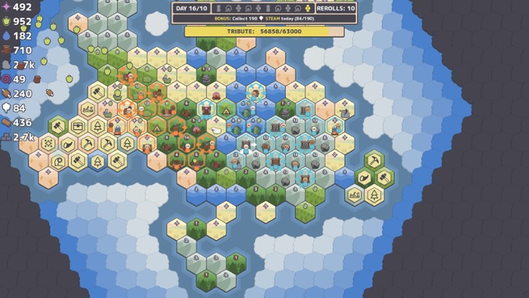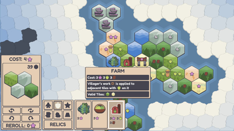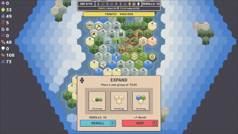 6 89%Game Brain Scoregraphics, musicgameplay, replayability89% User Score 70 reviewsA minimalist roguelike village builder where you place hexagon tiles, manage resources, and command your villagers.