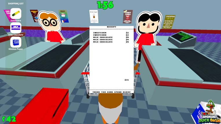 Supermarket Duck Dash is a funny physics based shopping game where you control a duck to do the shopping for old people in a supermarket. However, the duck only has wings to try and get the products from the shelves and into the shopping cart. FEATURING 3 DIFFERENT GAME MODES Arcade - Do the shopping for as many old people before the time runs out. Speed Dash - You have one go to try and get as… If you enjoyed this game, see our list of games similar to Supermarket Duck Dash.