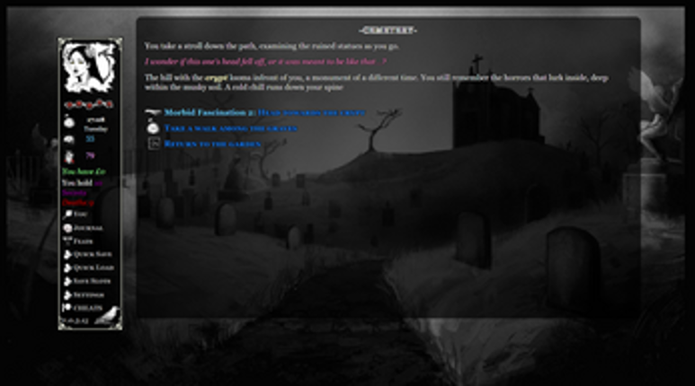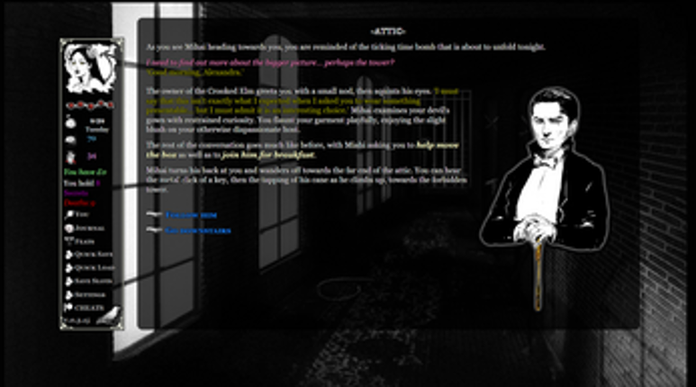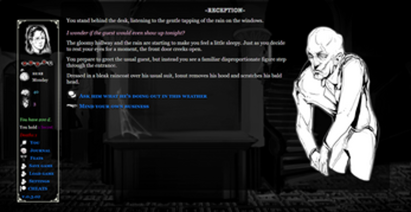 View Game9 96%Game Brain Score96% User Score 182 reviewsPlot: Transylvania is an erotic horror, text-based interactive game. You take the role of Alex, a university student undertaking a summer job abroad to finance his studies. An offer as a receptionist at a hotel in a remote mountain village catches your eye and you decide to go for it. You meet a cast of strange characters and quickly get tangled in a web of supernatural secrets and intrigue. Discl…