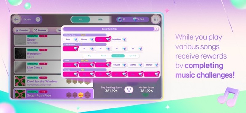HYBE Official Rhythm Game - Rhythm Hive ■ BTS, TOMORROW X TOGETHER, ENHYPEN, SEVENTEEN, LE SSERAFIM, NewJeans, BOYNEXTDOOR’s music in rhythm games! Enjoy full or short versions of Artist’s songs! One more news! You can even play solo and unit songs! Check out the newest songs and different versions of existing songs like "Take Two", "Never Let Go", "Deja vu", "XO (Only If You Say Yes)", "MAESTR… If you enjoyed this game, see our list of games similar to Rhythm Hive.