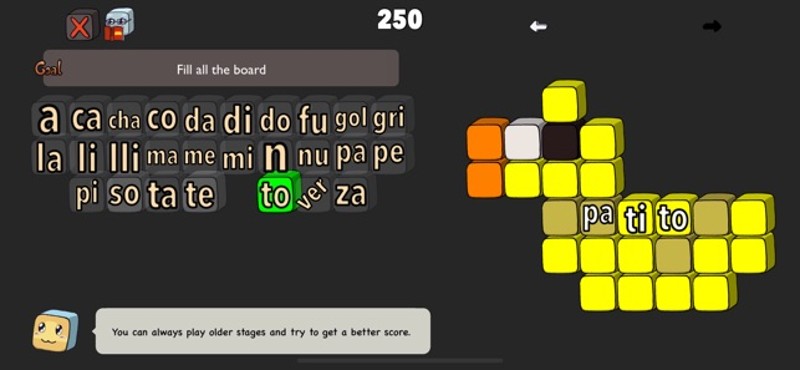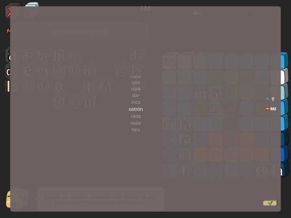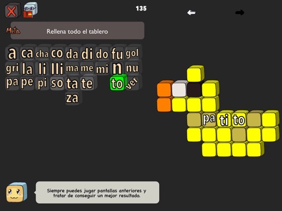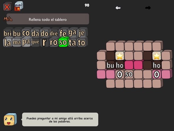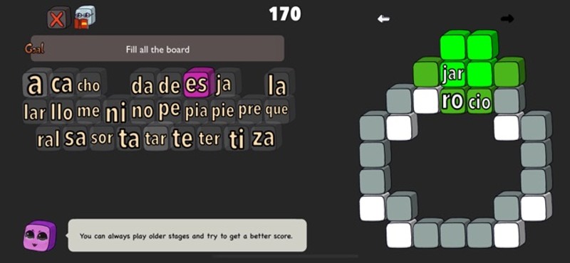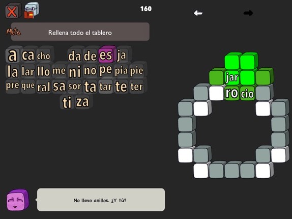 A puzzle game with Spanish words. Learn vocabulary while having fun! Features: * 89 hand-crafted unique stages. * Multiple solutions to each puzzle. * Compete with friends for a better score. * Can you make the longest word? * Check definition online in the Real Academia Española (RAE) dictionary. * Translate words online and listen to their pronunciation. Music: “Casa Bossa Nova”, “Carpe Diem”… If you enjoyed this game, see our list of games similar to Silabitas.