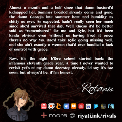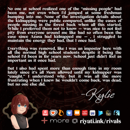 What happens when the past seeks vengeance, the present is lonely, and the future looks uncertain? While Kylie survived the kidnapping incident of June, it’s left her life in shambles, constantly confined under her mother’s supervision or locked in her bedroom. Worse, Kylie soon learns that while Asuza may be dead, his supporters are very much alive — including a certain familiar woman from the k… If you enjoyed this game, see our list of games similar to Riyati Rivals.