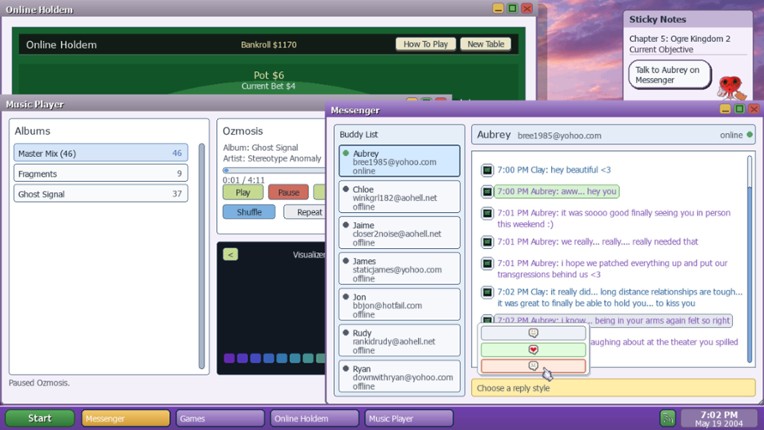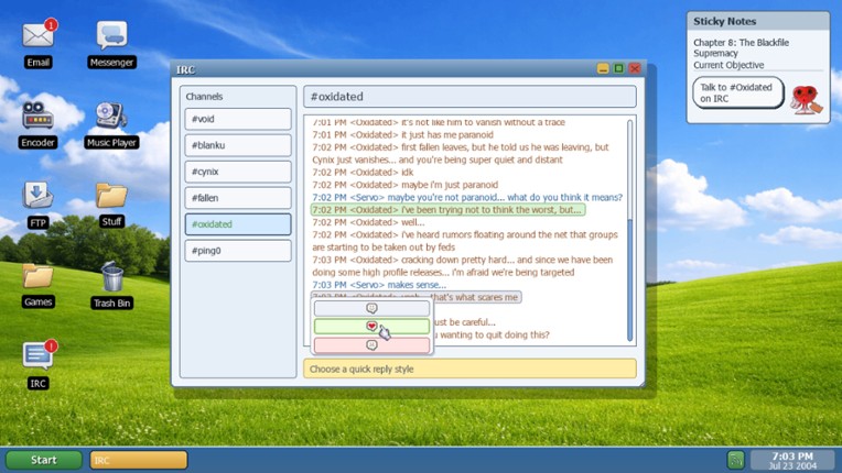 LifeSimOS is a story-rich coming-of-age experience set in 2004, where your world unfolds through a cluttered desktop filled with Messenger chats, IRC conversations, email, music, and late-night choices. Build friendships, navigate messy relationships, explore strange corners of the early internet, and shape your path through a branching story with multiple endings. Build your online persona by … If you enjoyed this game, see our list of games similar to LifeSimOS.