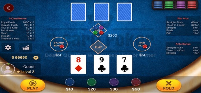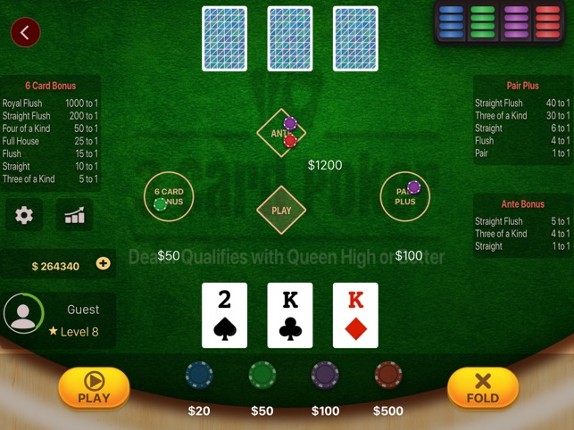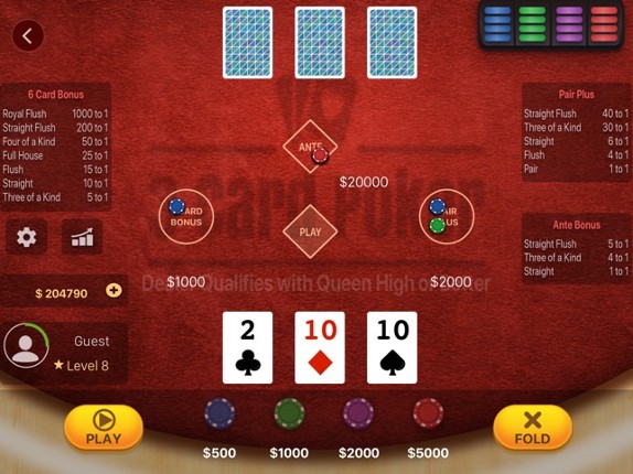 Three Card Poker is a popular card Poker variant played in real Casino. This is an online casino game of 3 Card Poker for iPhone and iPad! 3 Card Poker is played against the dealer using 3 cards hands. In this casino game three independent bets can be played - Ante, Pair Plus and 6-Card Bonus. The Ante bet is compulsory whereas other two bets are optional. You can start playing the 3 Card Pok… If you enjoyed this game, see our list of games similar to 3 Card Poker Casino.