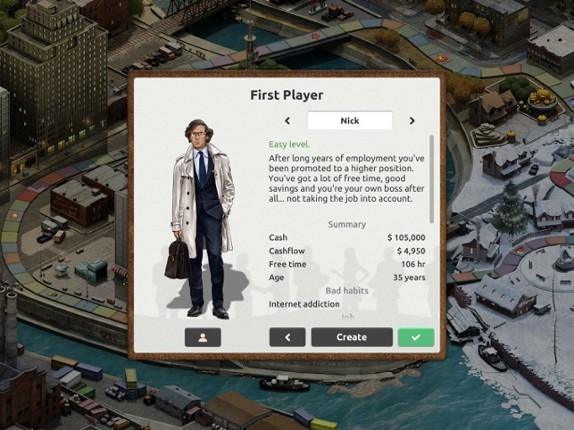 View Game3 87%Game Brain Scoregameplay, musicgraphics, replayability87% User Score 204 reviewsIn this simulator you will learn how to turn your time into money. Investment basics meet time management. Your goal is to make your dream come true. You can make a career, buy real estate, run business, trade stocks, become a blogger, or make a fortune on an art market. Study, network, and plan your time for all of it.