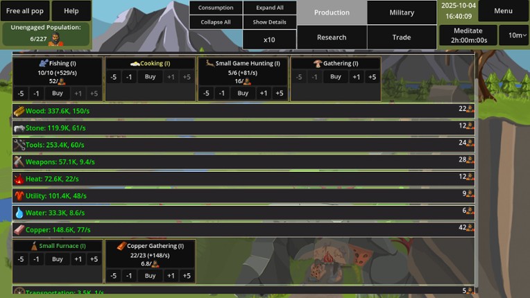 In To the Stars Idle you take control of the primitive stone age tribe to build and develop your way into the future. To progress, build new production chains, utilizing many resources. Each building consumes different resources to produce its output, so careful management is paramount. Starting with the basic Food, Wood and Stone, gradually advance to balancing up to 20 resources, each with thei… If you enjoyed this game, see our list of games similar to To the Stars Idle.