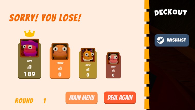 Deckout is a fast-paced, laugh-out-loud card party game. Each round generates a random target number (like 23 or 44). Everyone secretly picks 1–5 cards from a 7-card hand. Hands are revealed in seat order and scored instantly, with simple bonuses that keep choices interesting: The closest total wins the round. Coins, not hearts. Everyone starts with 50 coins. After each round, losers pay into a … If you enjoyed this game, see our list of games similar to Deckout.