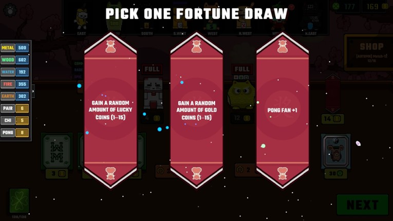 FOLLOW US About the GameFeng Shui Meowjong is a unique light roguelike card game that fuses traditional mahjong mechanics with roguelike progression and mystical Feng Shui-inspired tactics.In this strategic turn-based system, you reinterpret classic mahjong gameplay using a fixed set of 14 tiles to form combinations such as Chi (Chow), Pong (Pung), and Pair. At the same time, you activate powe… If you enjoyed this game, see our list of games similar to Feng Shui Meowjong.