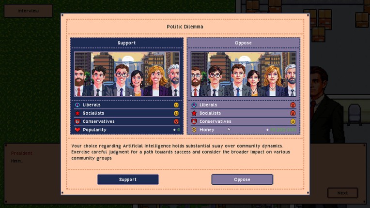 (I'm still in the early stages of developing this game, so things might change along the way. Thanks for your understanding and support!)Welcome to Presidential Rise, an intricate strategy management game that plunges you into the heart of political maneuvering. As the head of a fledgling nation, you must balance economic growth, public perception, and policy-making to steer your country towards p… If you enjoyed this game, see our list of games similar to Presidential Rise.