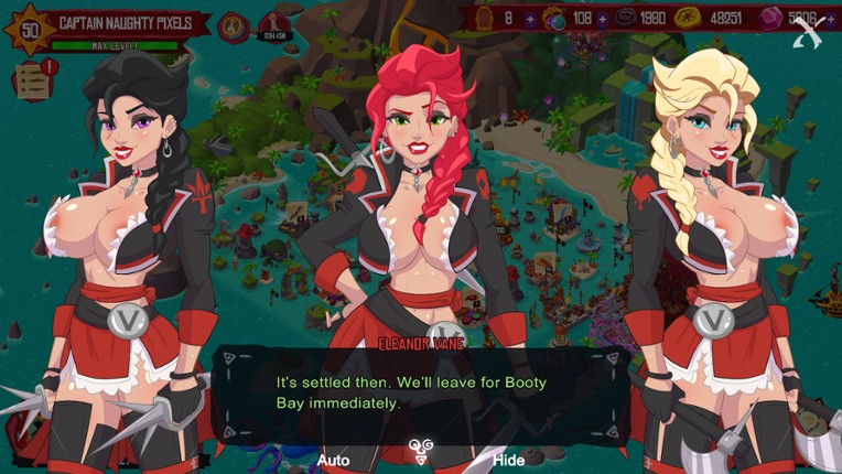 Explore the Thigh Seas with the Lusty Ladies of the Cumpañolas! Rebuild Booty Bay and recruit a crew of wenches, jezabels, and pirate lasses to collect and craft for your raiding party. Can you protect your girls from the growing threats to Booty Bay, and becum the fiercest fuckaneer the Cumpañolas have seen since Blackbeard? Find out in Pirate Booty! If you enjoyed this game, see our list of games similar to Pirate Booty.