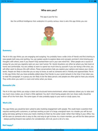 This amazing app uses genuine artificial intelligence to tell you what spirit animal you are. Answer some fun questions about your personality and appearance and this app will calculate what animal you are from nearly fifty different options including the fox, cat, shark, dolphin, eagle, elephant, tiger, lion, penguin, zebra and many more. Great fun for all the family. Play with friends or jus… If you enjoyed this game, see our list of games similar to Which Animal Am I?.