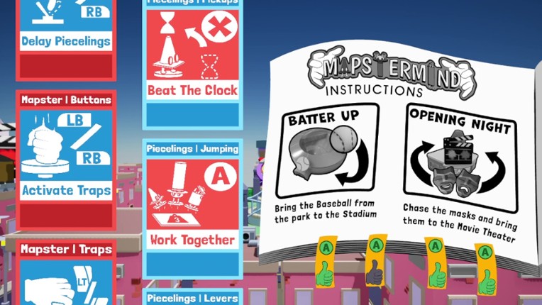 Experience a new take on the party game genre with Mapstermind’s array of cute characters, two unique game boards with exciting mechanics, and one evil pair of floating hands! Choose Your CharacterPick from 9 uniquely adorable Piecelings or don the white gloves of the Mapster! Complete Cooperative Tasks As the PiecelingsBe a giant clam’s stylist, catch a home run, bring a mermaid her crown, and… If you enjoyed this game, see our list of games similar to Mapstermind.