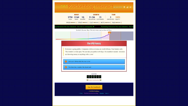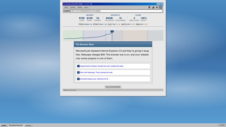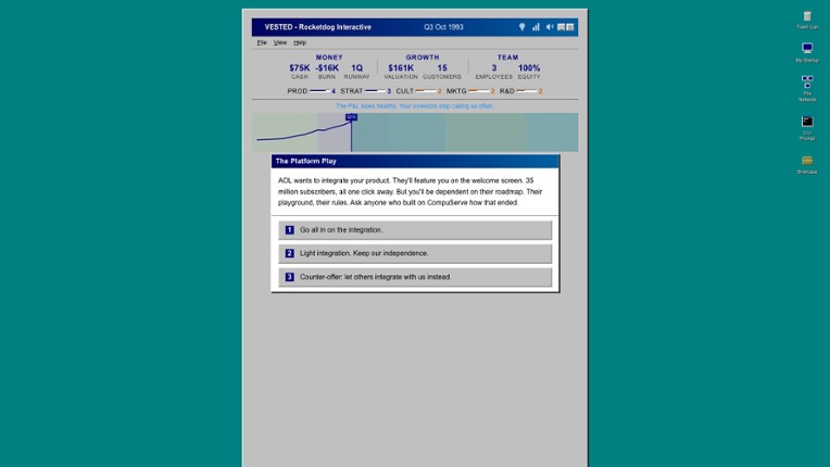 It's 1990. You have an idea, a business card, and the vague sense that this "internet" thing might be worth something. You're probably right... you're also probably doomed.Build. Burn. Repeat. Vested is a narrative strategy game about founding a tech startup and trying (really trying) to survive the dot-com bubble. Make quarterly decisions that ripple across your company's finances, cul… If you enjoyed this game, see our list of games similar to Vested.