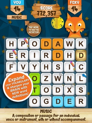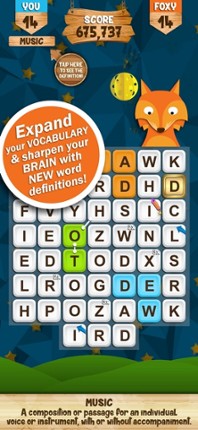 1 87%Game Brain Score87% User Score 124 reviewsCompete with Foxy to find the best words on the board! In Words with Foxy you play against Foxy and compete to earn the most letter tiles on the board. Each letter used in a word will turn your color. Foxy will make words as well and turn the tiles to his color. There's no time limit, just turn for turn to see who can make the best words and own the most tiles at the end of each level. You need …